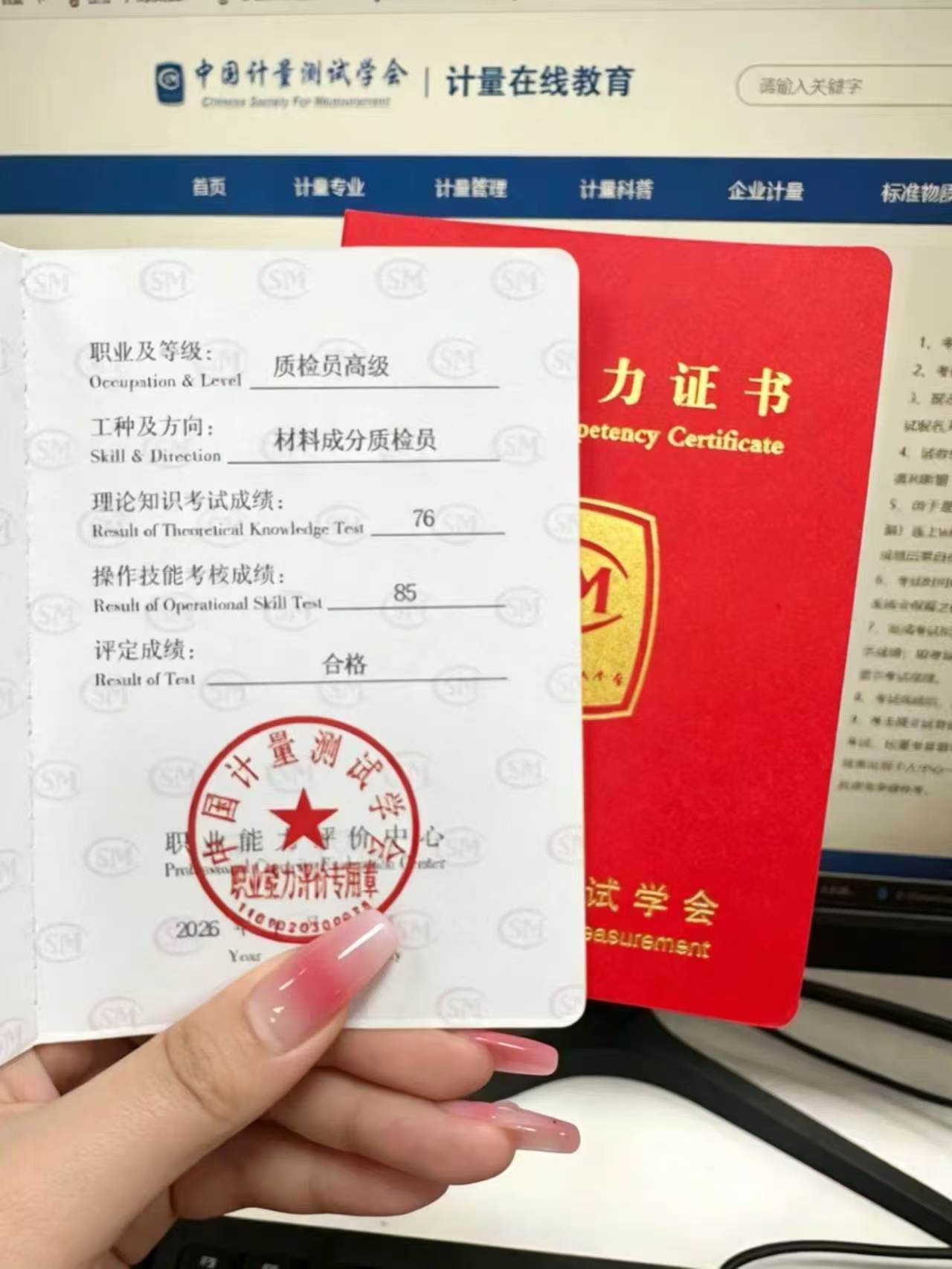 材料成分质检员职业能力证书,由中国计量测试学会统一颁发,该学会由国家市场监督管理总局主管,是正规学术社团,证书颁发流程规范、行业认可度高,具备极强的通用性,是材料检测领域公认的有效职业能力凭证。