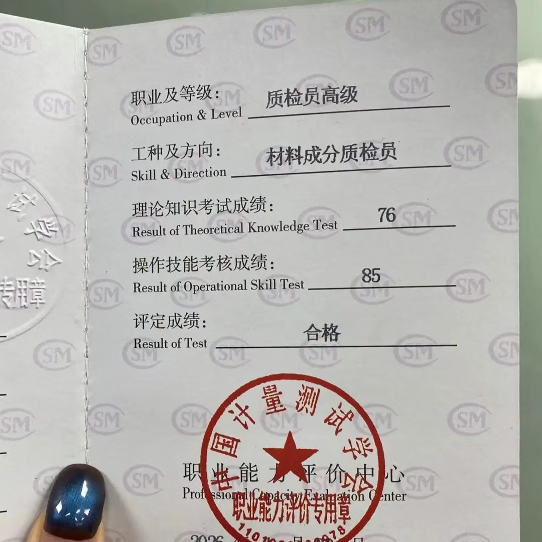 无论是刚入行的新手、职场提升的在职人员,还是想要转行进入质检行业的朋友,材料成分质检员证书都是性价比极高的技能选择,既能提升专业能力,又能为职场发展加码,是材料检测领域不可或缺的凭证。