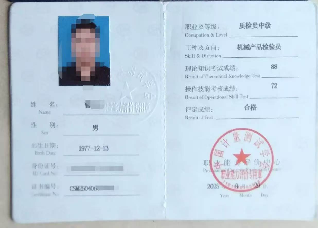 2. 中级证书:具备大专学历,拥有1年及以上机械制造、品质检验相关从业经验,适配在岗普通质检从业人员;