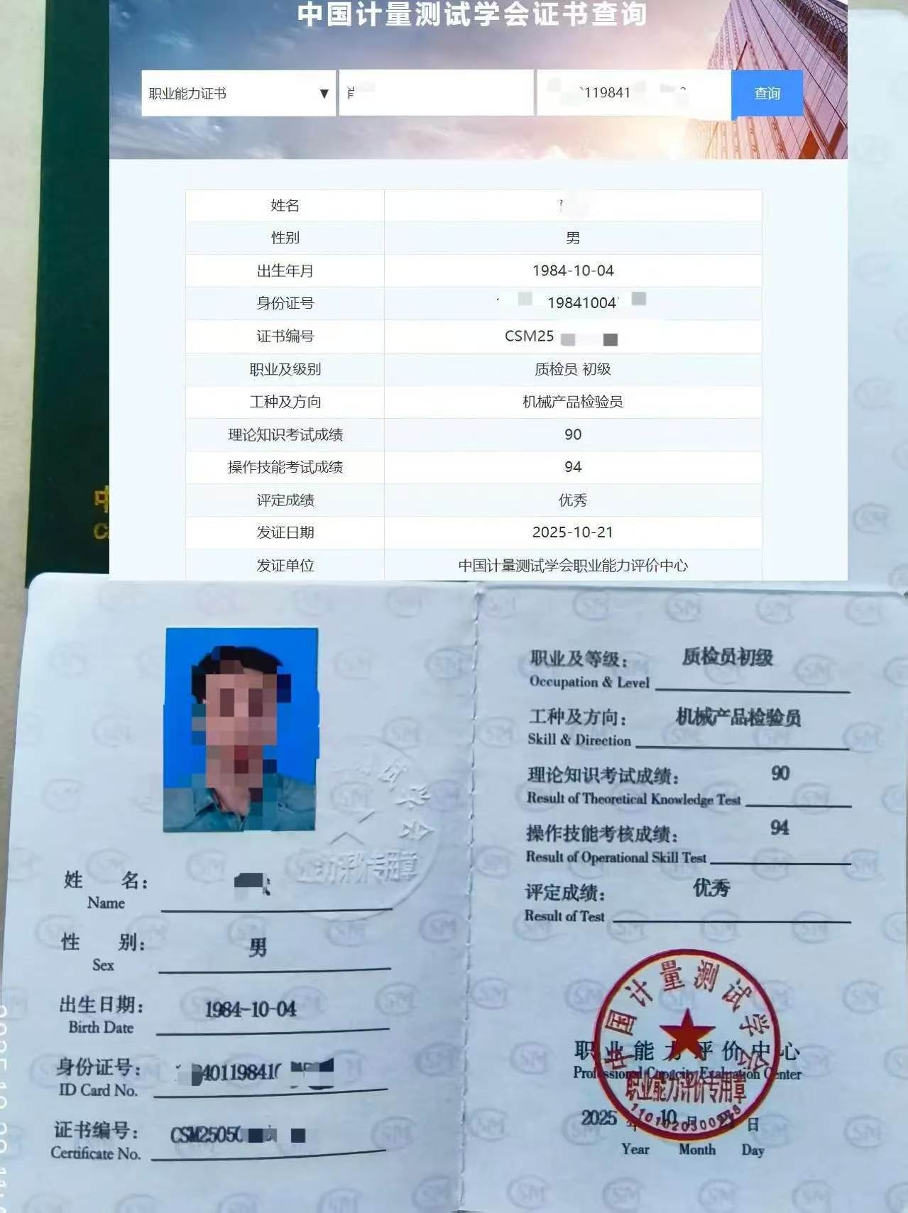 机械产品检验员证书由中国计量测试学会正规颁发,行业认可度高,报考人员完成系统配套培训并通过考核后,即可顺利申领该证书。证书自带专属备案编号,支持线上核验,信息真实可查、安全可靠,适配求职、入职、岗位晋升等多种职场场景,能有效助力个人职业发展,为职场竞争力加分。